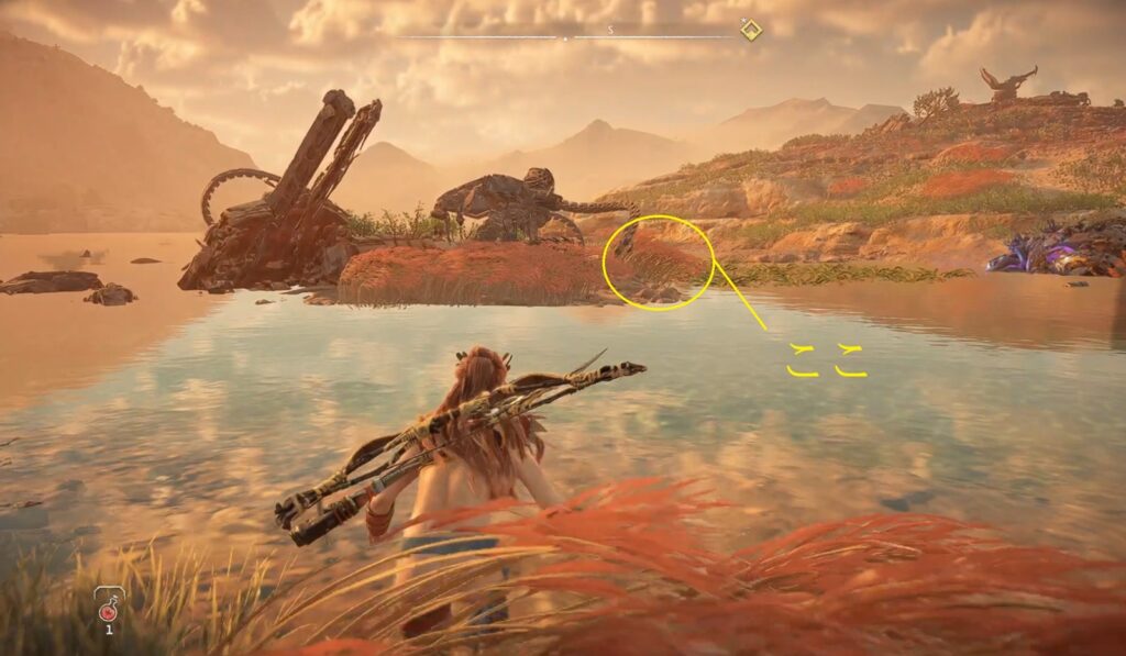 3頭のワイドモウが残りますが、用があるのは一番奥の1頭だけです。手前の2頭は倒しても構いませんが、戦うと一番奥のワイドモウがどれだか分からなくて倒しちゃうかもしれません。時間もかかるので戦わずに一番奥のワイドモウに忍び寄りましょう。狩場はここです。