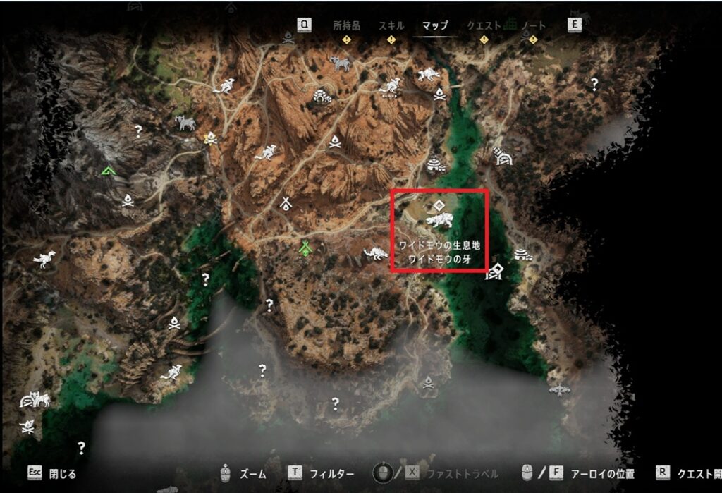 ワイドモウの牙を取るのは「カージャの野営地」近くの「ワイドモウの生息地」です。