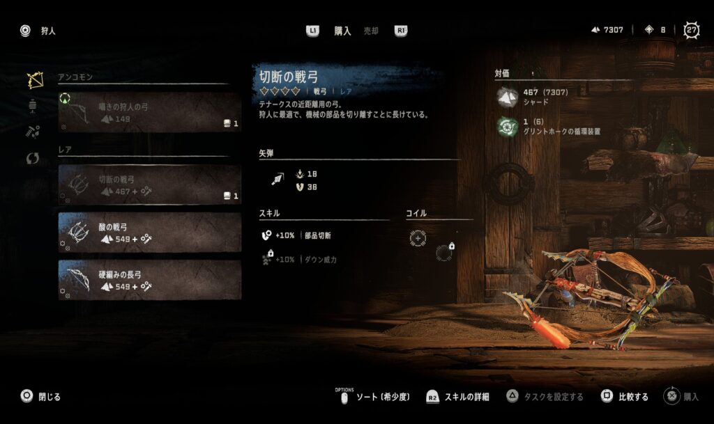 初心者は攻撃力が弱くて切断力が比較的高い「切断の戦弓」を買っておきましょう。近くのカージャの野営地で売っています。強力な弓で牙を何度も打ち損じると、牙を取る前にワイドモウが倒れてしまうからです。
