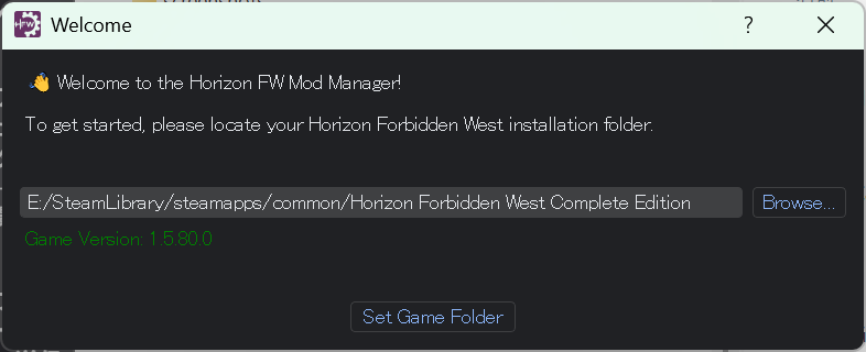 「Browse」ボタンを押し、Horizon Forbidden West のフォルダ(HorizonForbiddenWest.exe があるフォルダ)を指定します。私はEドライブにゲームをインストールしているので、以下のフォルダにありました。