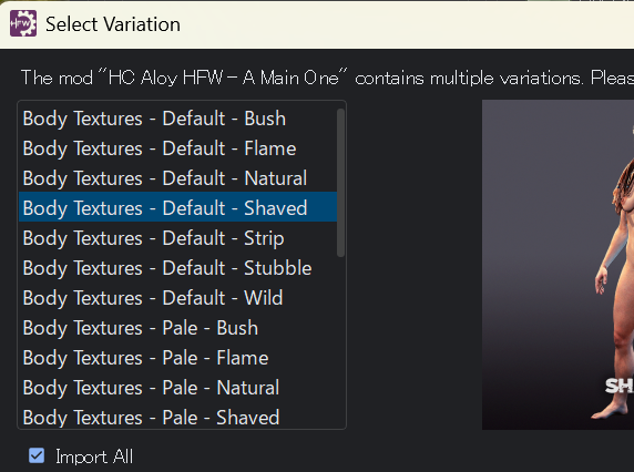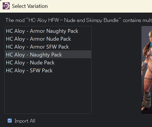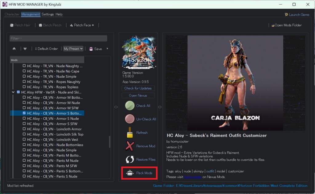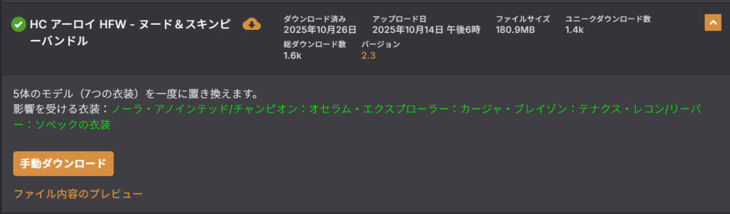 次にHC Aloy HFW – Nude and Skimpy Bundle(“HC Aloy HFW – Nude and Skimpy Bundle-122-2-3-1760432412.zip”)をダウンロードし、HFW_Mod_Managerにドラッグアンドドロップします。