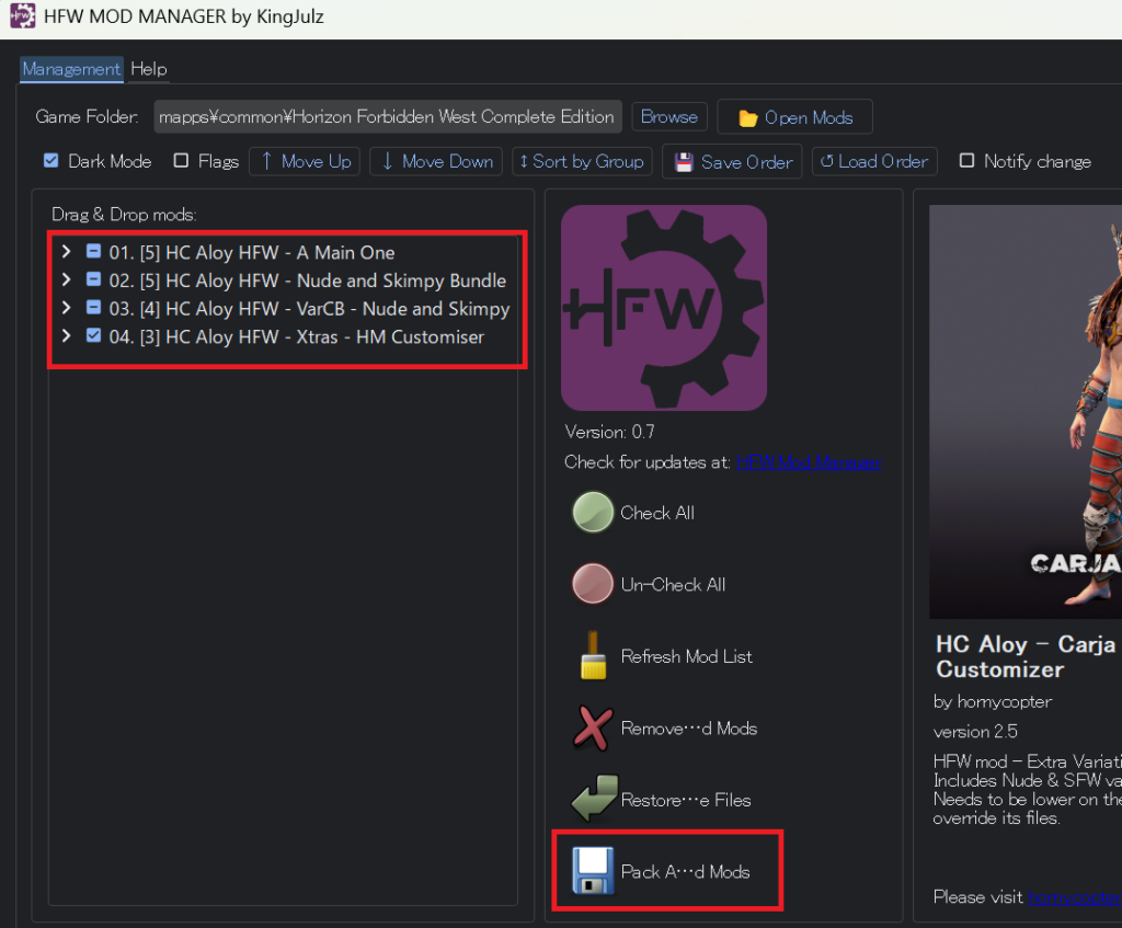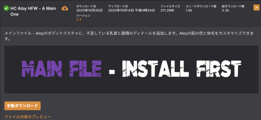 まずメインファイル HC Aloy HFW – A Main One (“HC Aloy HFW – A Main One-122-2-5-1760427289.zip”)をダウンロードし、HFW_Mod_Managerにドラッグアンドドロップします。