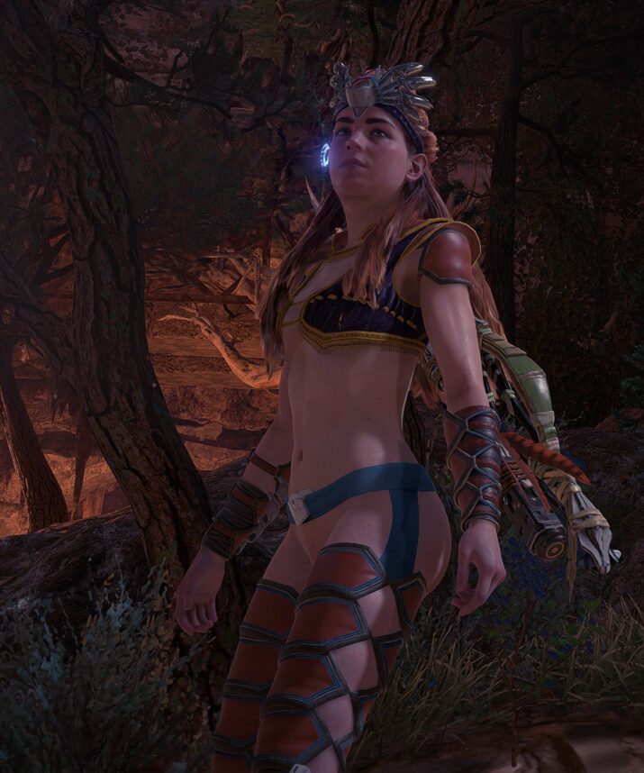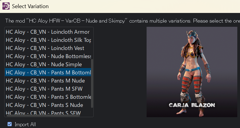 以上の手順で涼し気な衣装に代わりますが、基本とする衣装を更に変更したい場合は追加衣装をダウンロードします。 Carja Blazon(カージャ・紋章の服)を任意に選択したい場合は更にHC Aloy HFW – VarCB – Nude and Skimpy(”HC Aloy HFW – VarCB – Nude and Skimpy-122-2-5-1760433390.zip”)をHFW_Mod_Managerにドラッグアンドドロップしてインストールします。