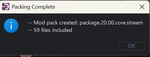 「Packing Complete」ウィンドウが表示されMODの適用完了です。