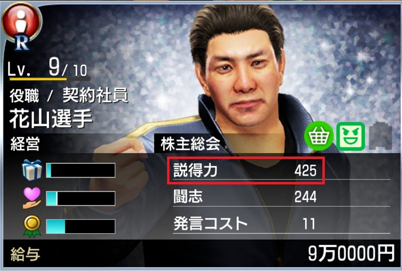 「後だしジャンケン」ゲームであることを理解すれば、自ずと「赤」「緑」「青」全ての属性の社員が必要であることが分かります。なお、説得力=攻撃力なので、説得力の高い社員を選んで構成しましょう。