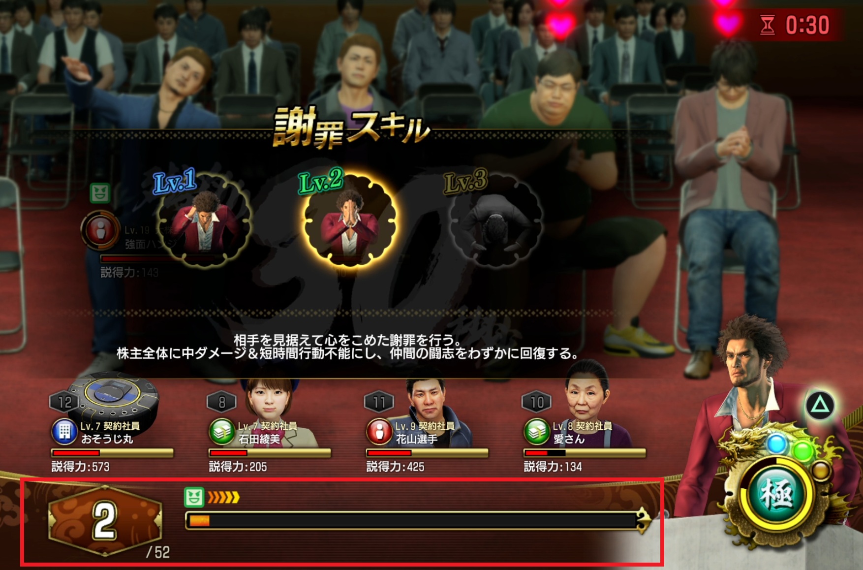 以下は発言コスト(MP)残量が「2」しか無く、社員の攻撃ができない状況です。右下の一番を見ると青Lv.1、緑Lv.2のランプが灯っています(黄色Lv.3は未点灯)。一定の時間が過ぎるとゲージが溜まり、一番がLv.1~Lv.3の3段階の謝罪(攻撃)ができるようになります。