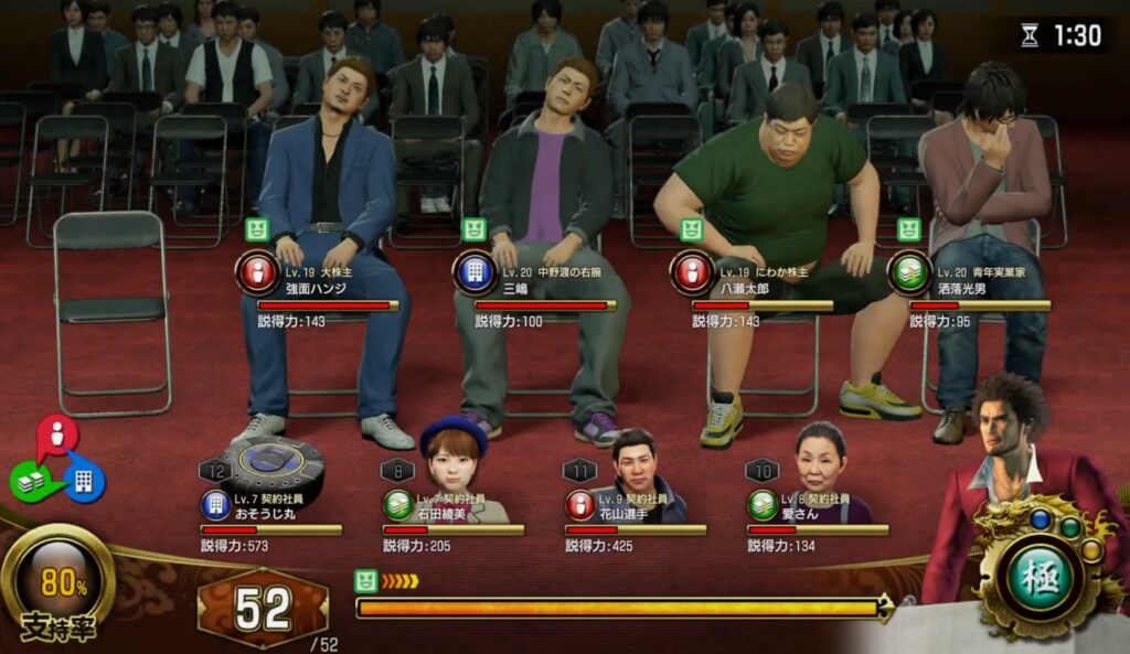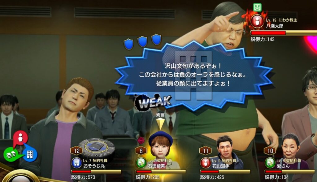 株主総会は「後だしジャンケン」ゲームです。敵の質疑の属性(吹き出しの色)より強い属性(色)の社員を選んで攻撃すれば勝てます。
