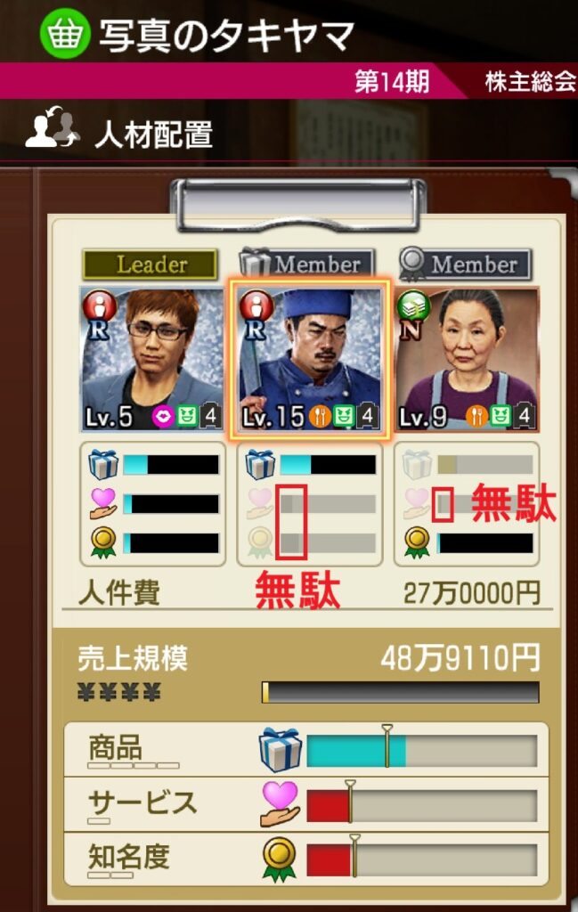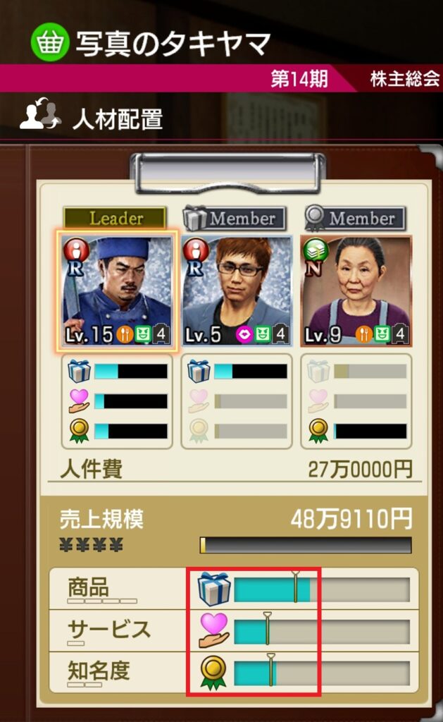 以下の「写真のタキヤマ」ではサービス、知名度を満たしたいのにメンバーのスキルが無駄になっています。2人目、3人目のスキルが採用されるルールとは?