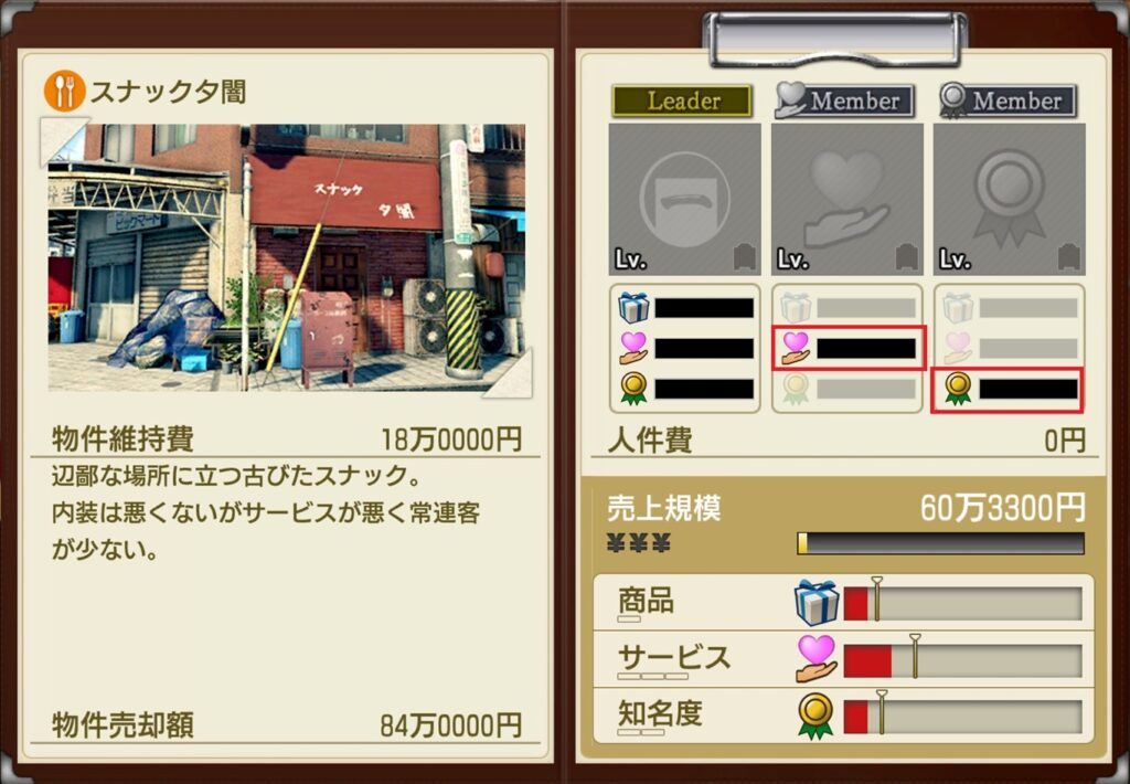 「スナック夕闇」では2人目のメンバーは「サービス」スキルが採用され、3人目のメンバーは「知名度」スキルが採用されます。