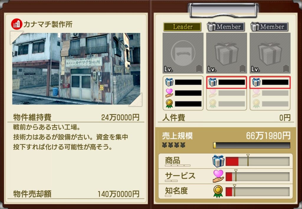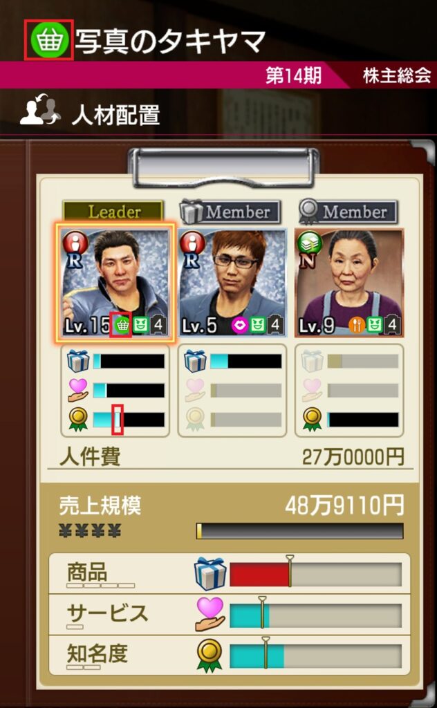 リーダーは商品・サービス・知名度の3つのスキル全てが採用され、2人目、3人目のメンバーの採用されるスキルは物件ごとに決まっています。